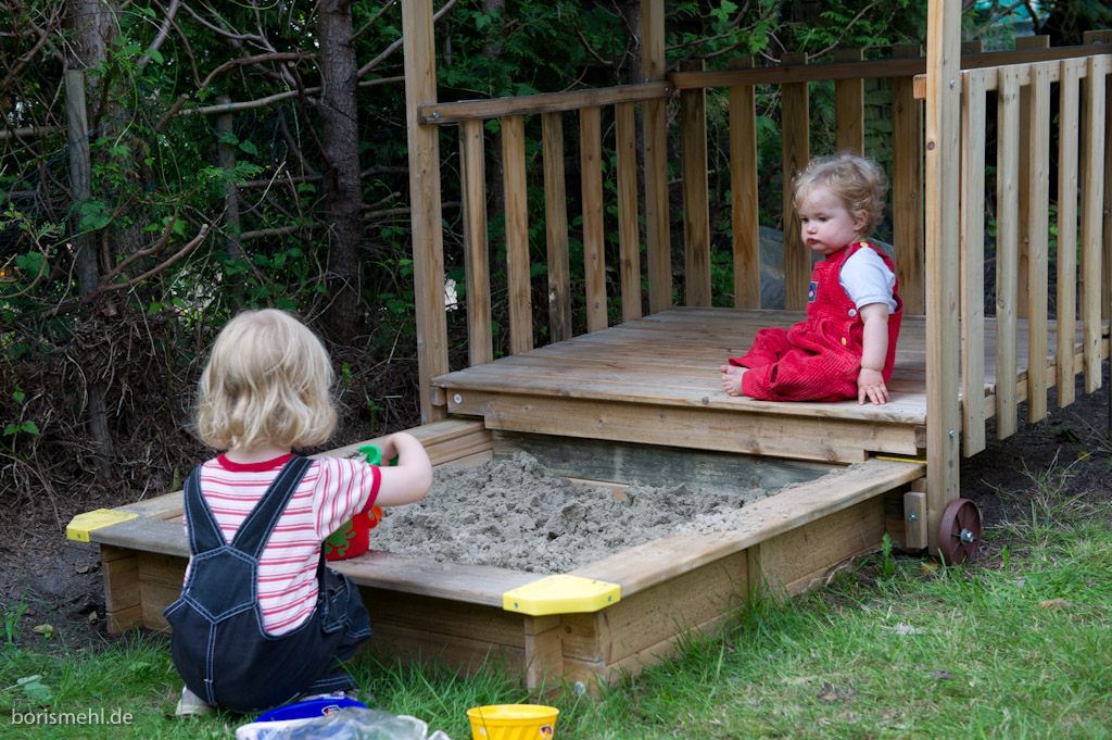 Morgens um acht war der Dachdecker wieder da. Jetzt haben wir Windbleche und Regenrinnen auf beiden Seiten. Jubel! Dann nachmittags noch den Sandkasten verschoben und gefüllt, den Rasen gemäht und in der zukünftigen Küche an der Stirnseite die Bretter festgeschraubt. Viel geschafft…