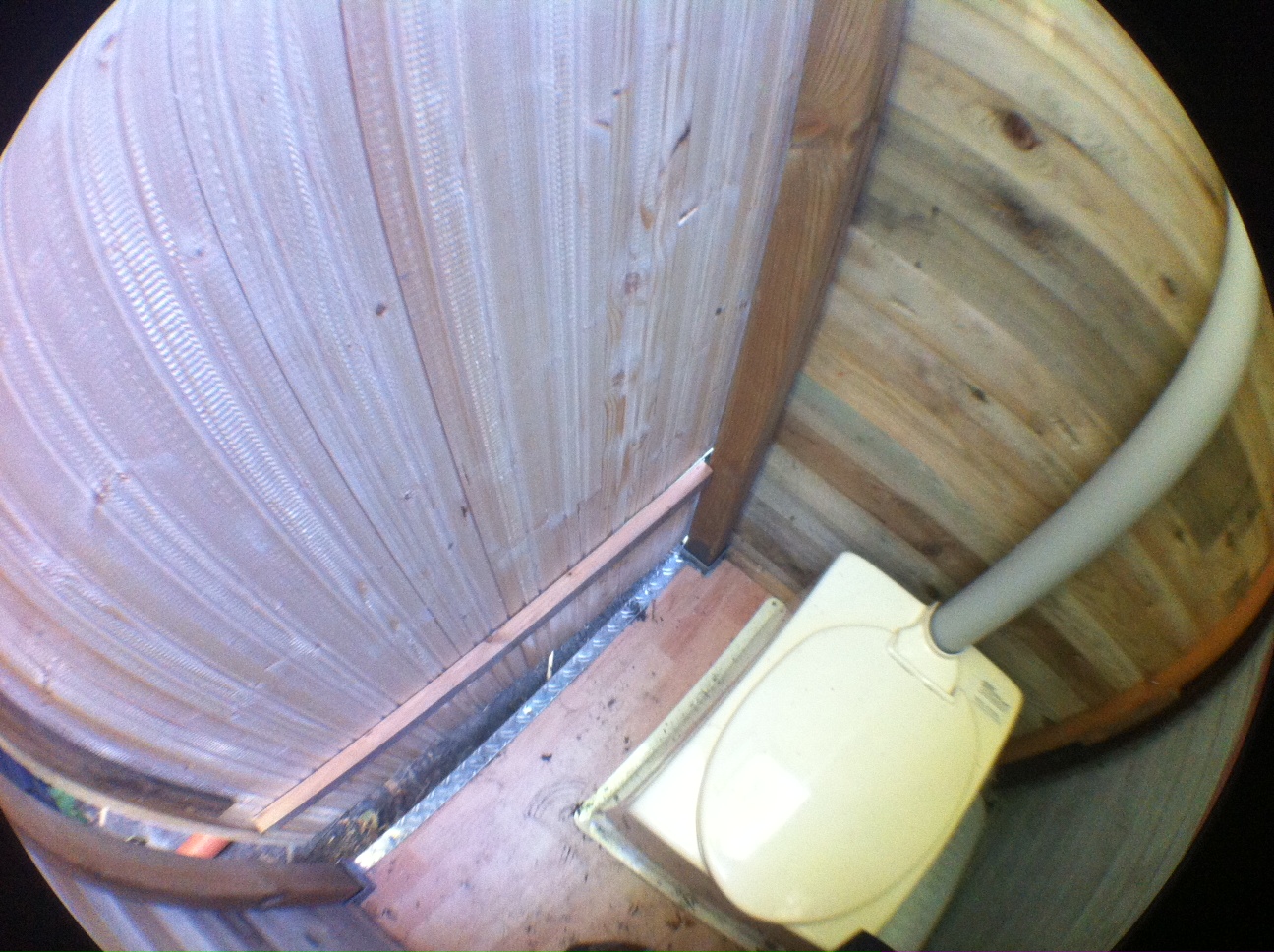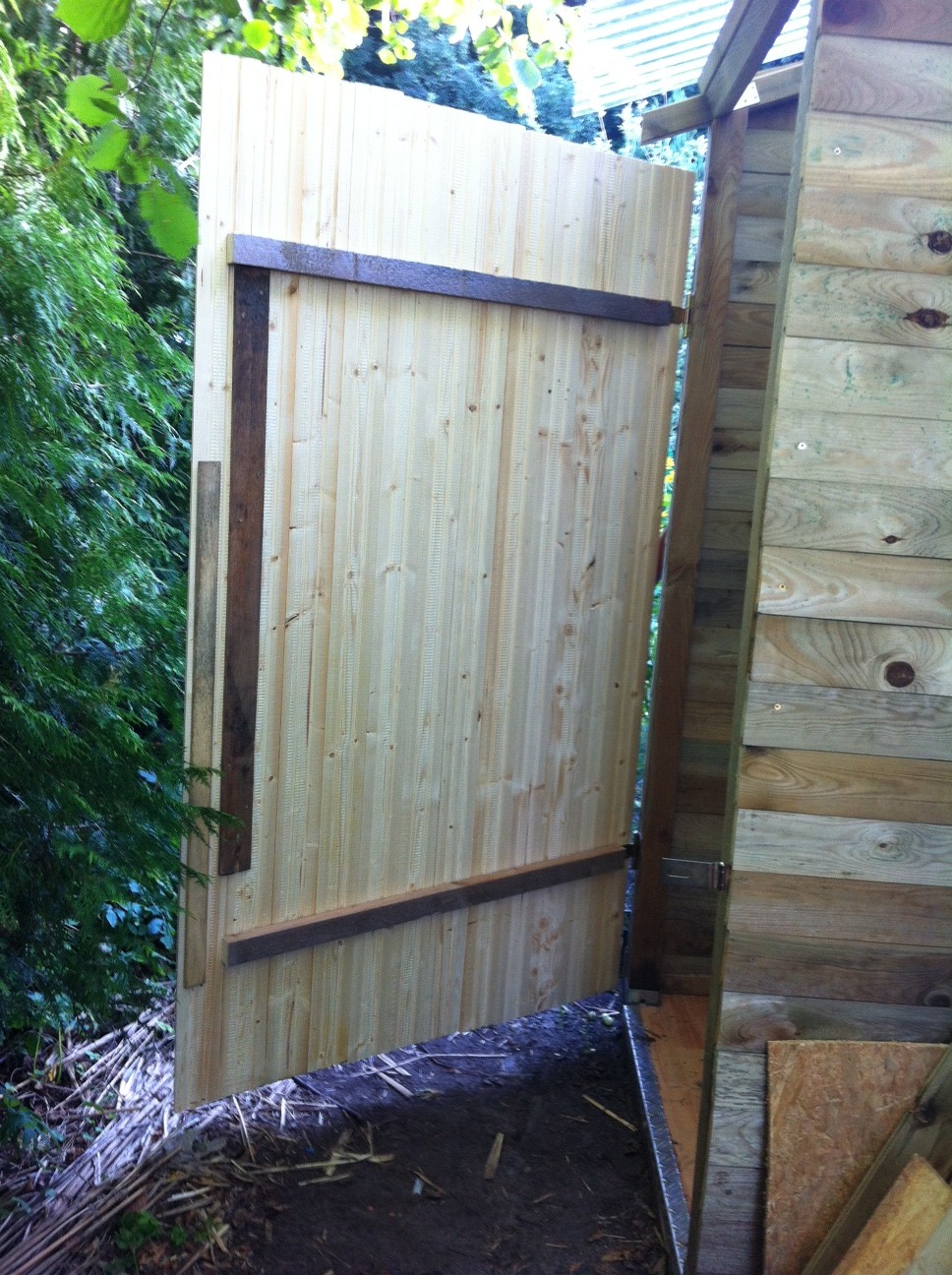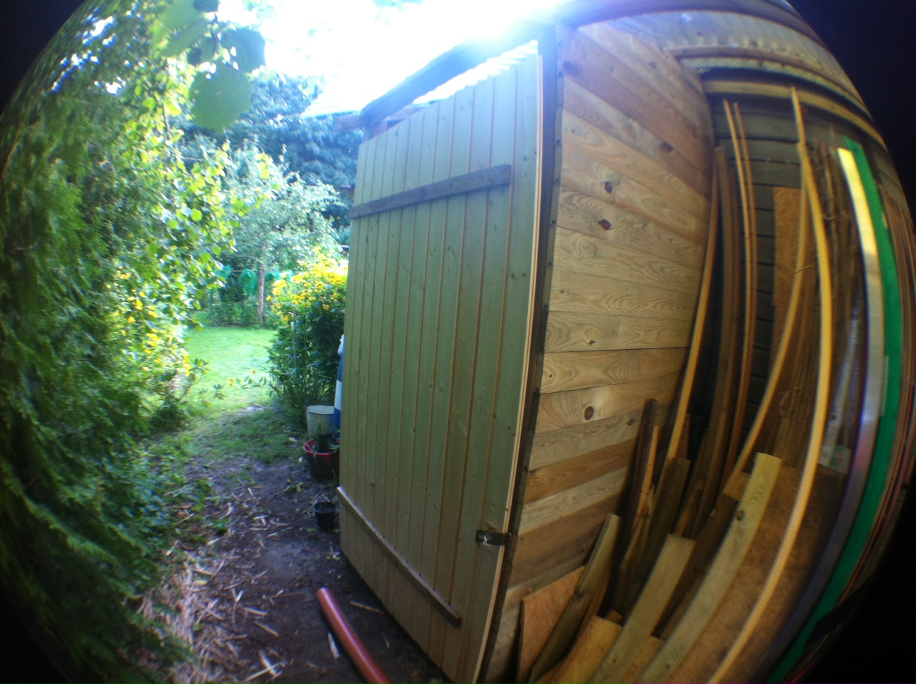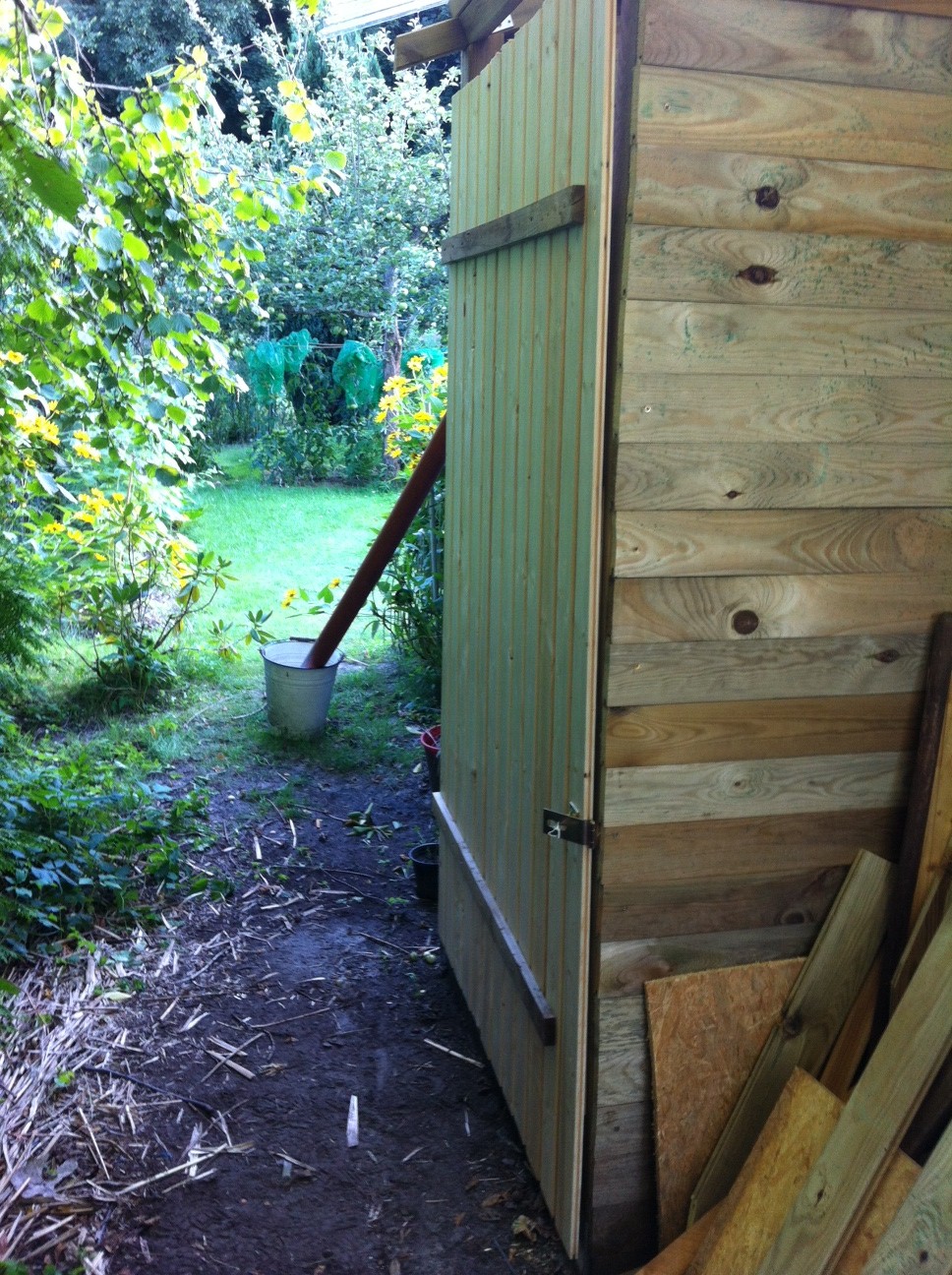 Geschafft, die Klotür ist fertig. Drei Stunden Sägen und Schrauben. Hat aber soweit geklappt. Details und der Anstrich müssen noch gemacht werden.