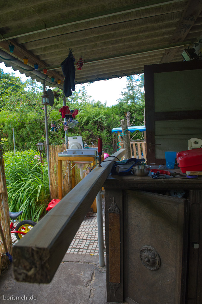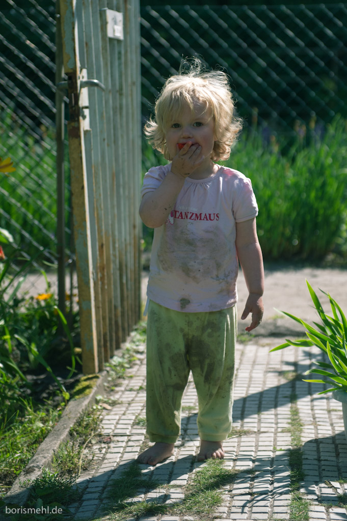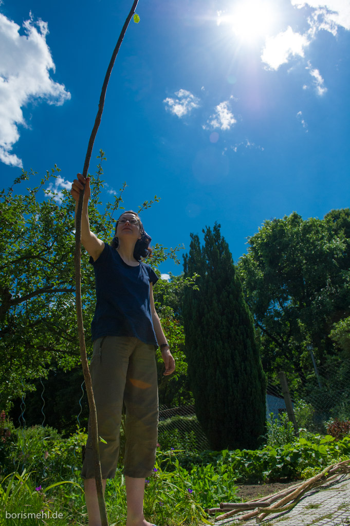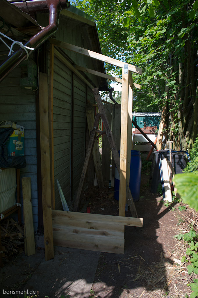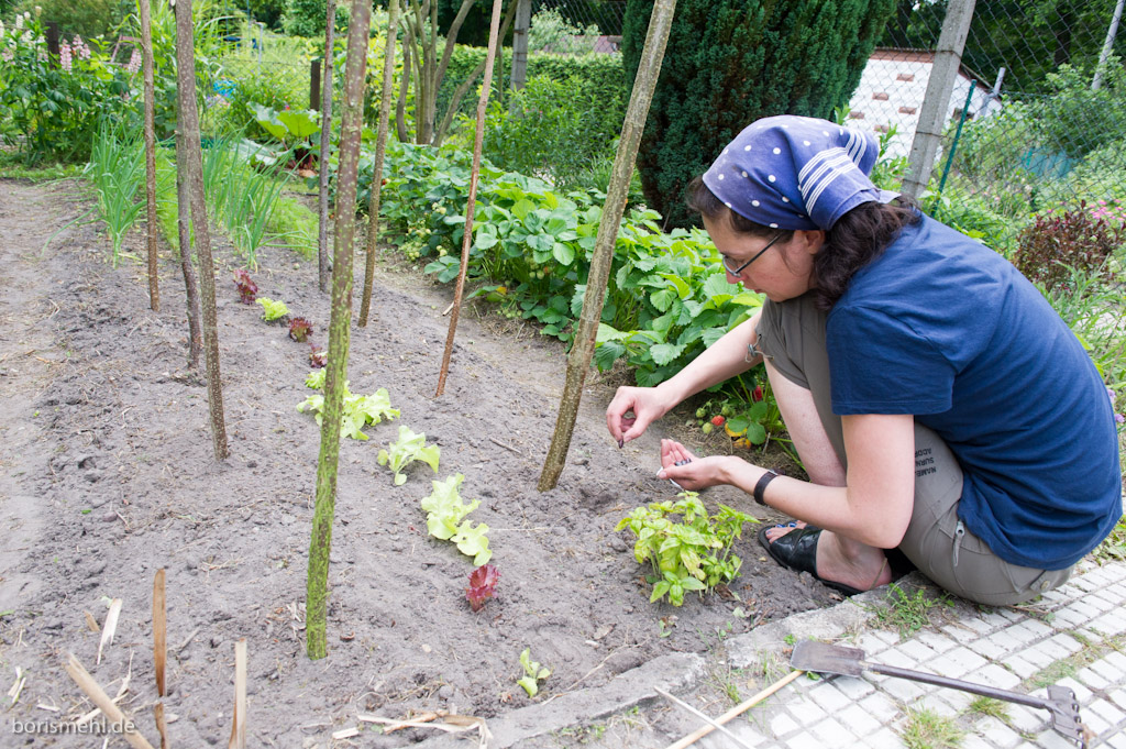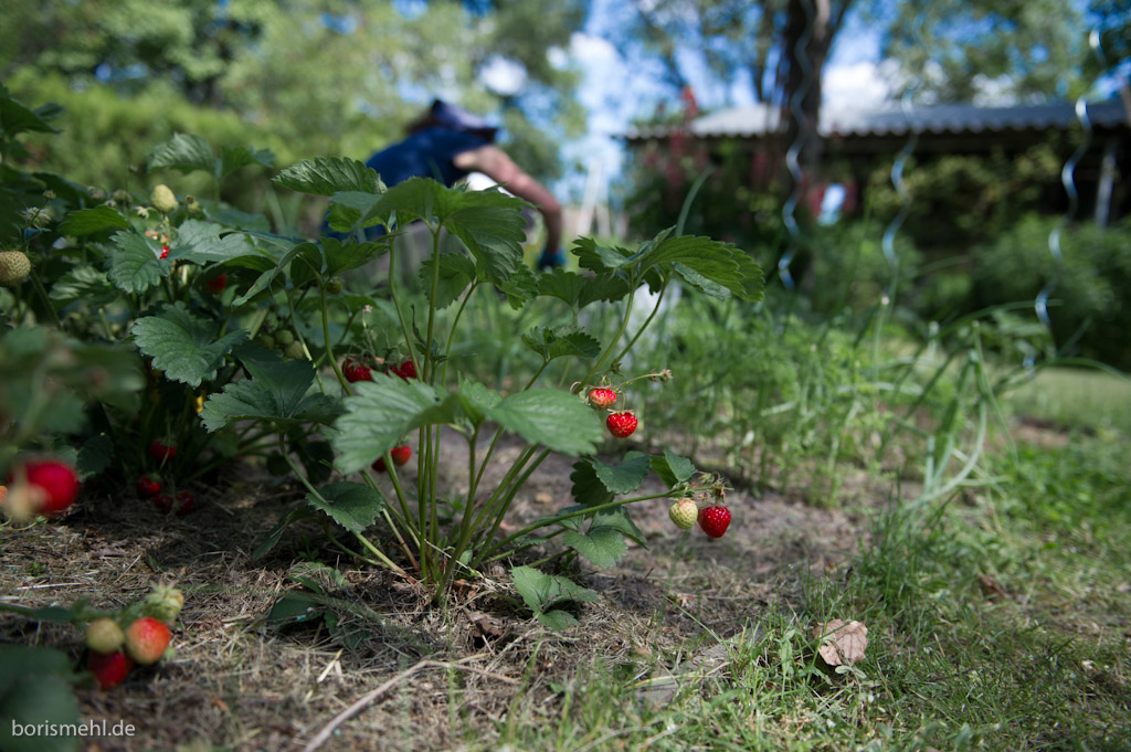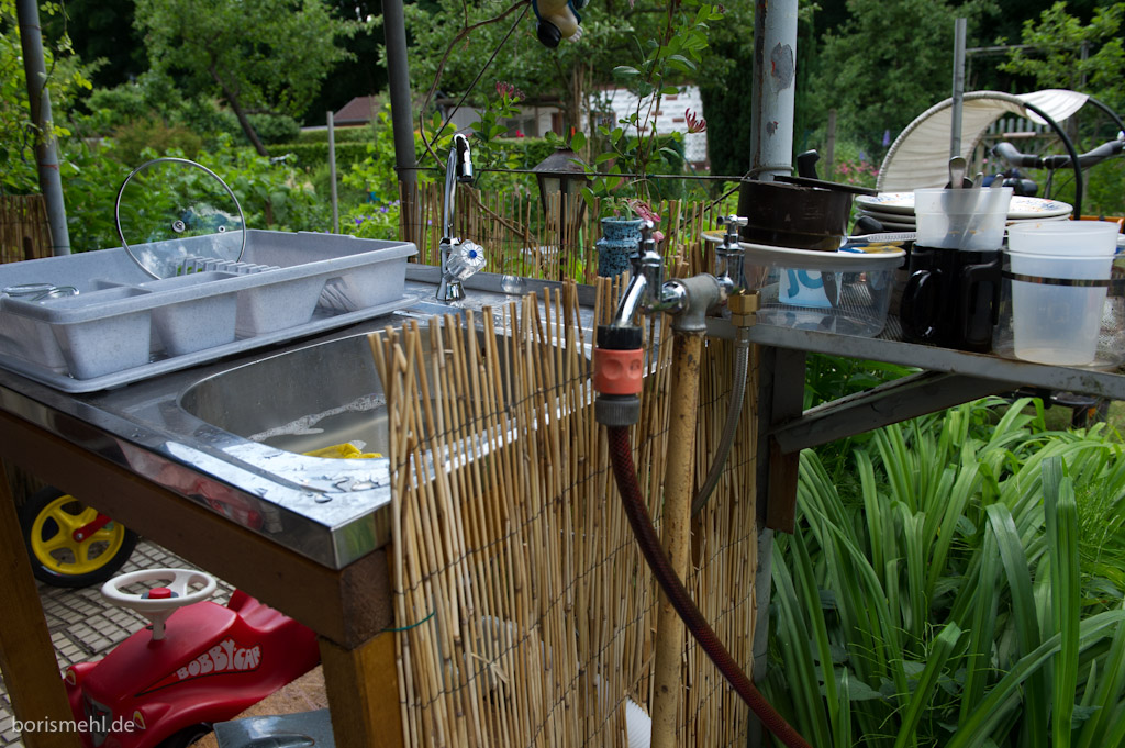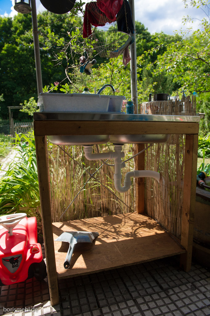 Toilette bauen, Bohnen säen, Wasser und Abwasser am Spültisch montieren, Bambusmatten als Sichtschutz aufbauen, Erdbeeren ernten, Rasenpflaster ausstreuen – viel gemacht! Und die Kinder haben mit Fidi und Johann toll gespielt! Sehr entspannt, so sollten Samstage im Garten immer sein!