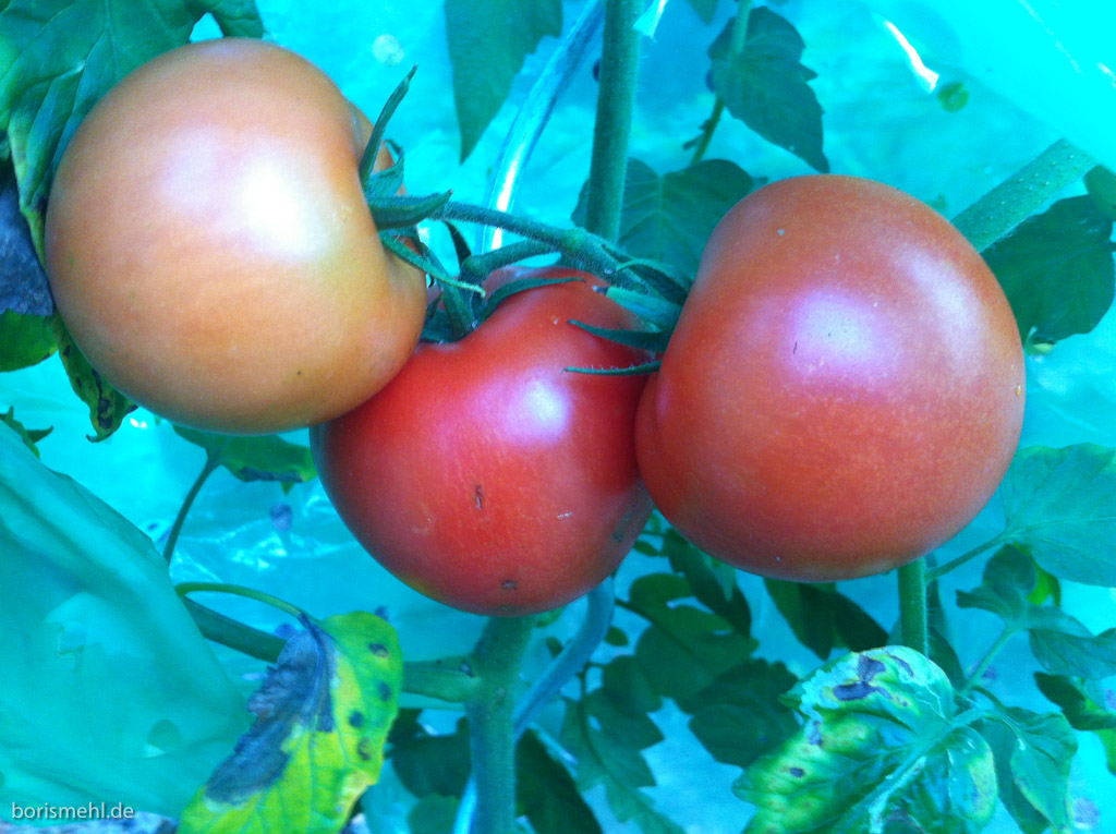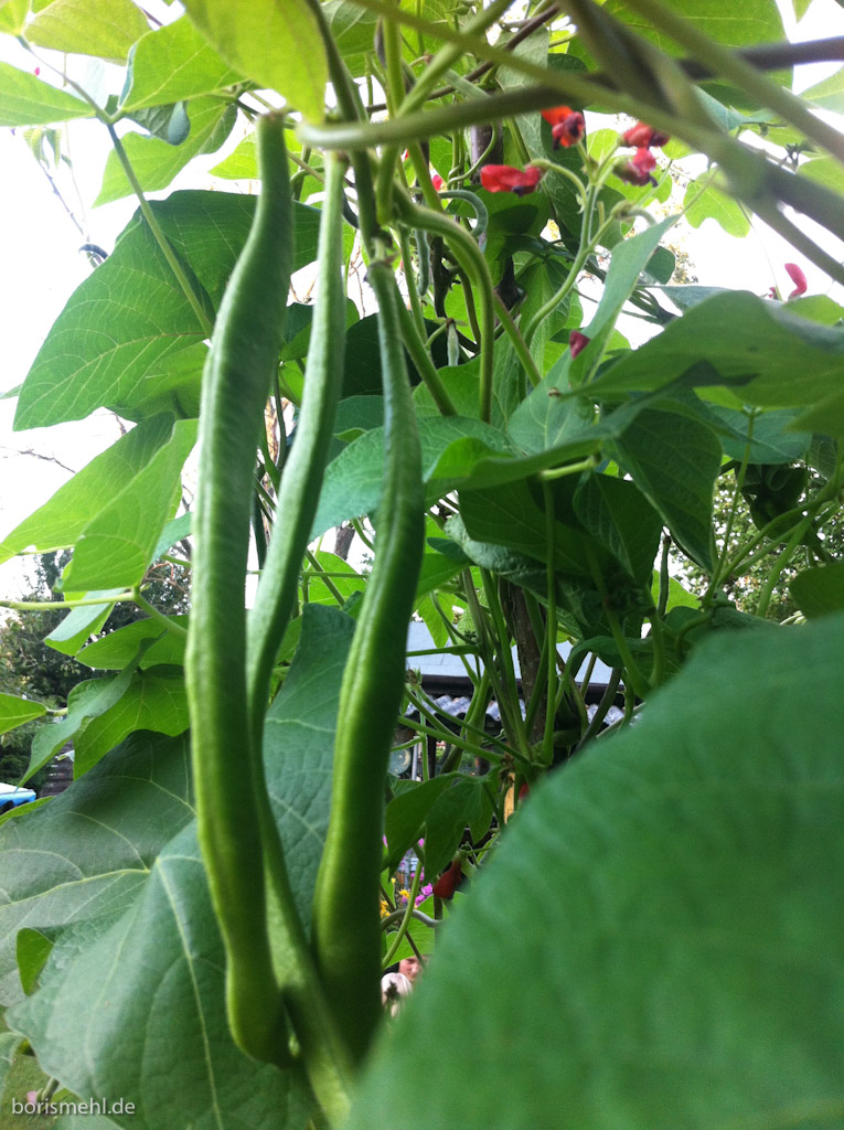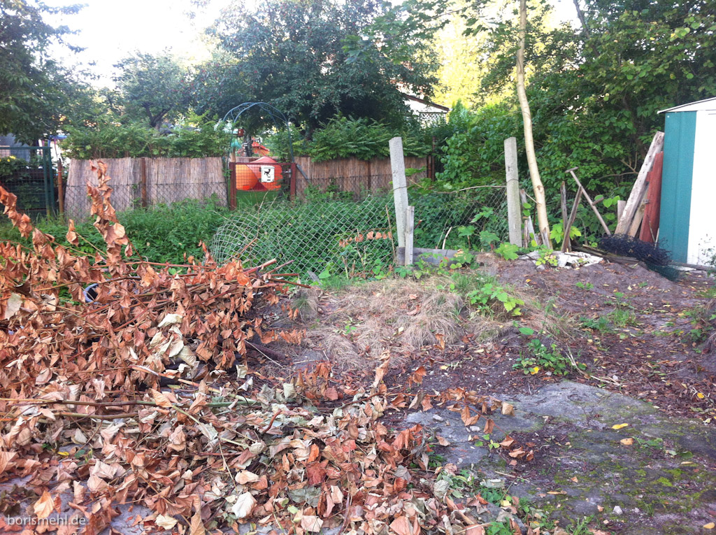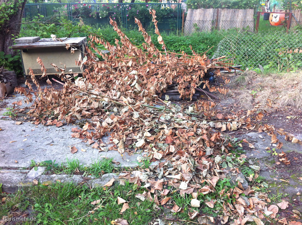 Nach zehn Tagen ohne Garten waren wir heute nach der Arbeit endlich wieder dort. Die Bohnen wachsen, die Schnecken fressen, die Tomaten sind schön rot. Alle glücklich also? Naja, hinten liegt der Schnitt von unserem Bambus. Schön getrocknet. Zum Häckseln kam ich heute nicht wirklich. Es sieht aber schön offen aus nach hinten… Wird schon.