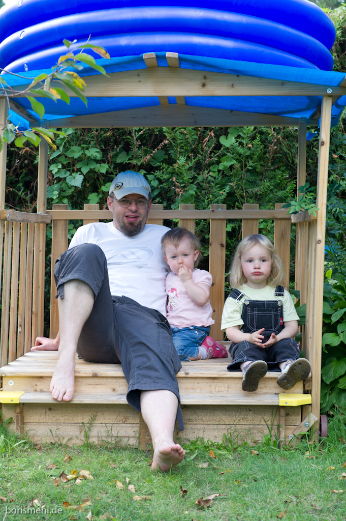 Der Plattenweg zum Geräteschuppen ist auch komplett ausgegraben. Fertig! Jetzt wird der Haufen Erde durch ein Sieb geworfen und gleichmäßig verteilt. Die ersten Ideen zur Gestaltung spinnen im Kopf herum. Es wird. Aber vorher muss die Fensterseite der Hütte gemacht werden.