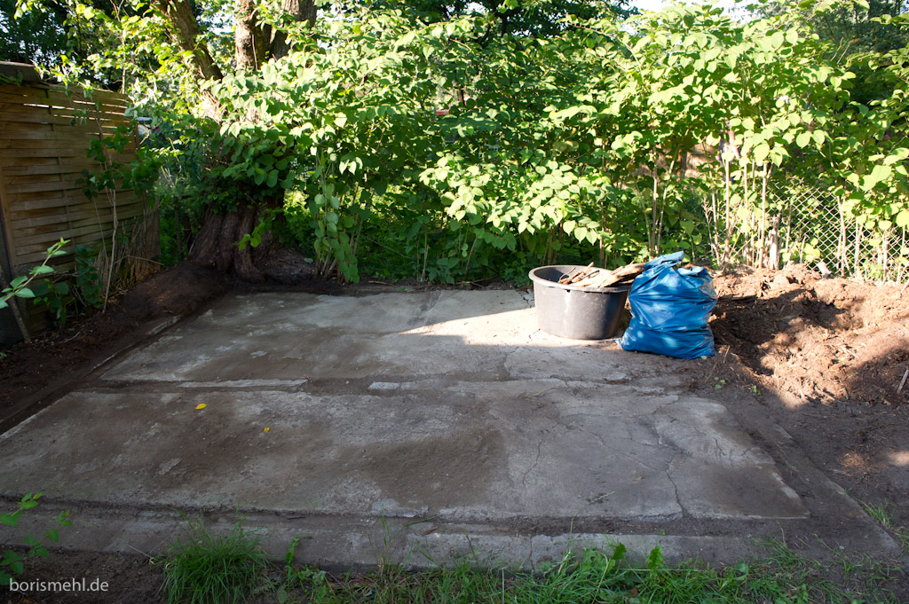 Die Platte hinter dem Haus ist gefegt und leer. Großartig! Der Haufen rechts neben der Platte war bis heute nicht so … sagen wir mal zu sehen. Man findet darin altes, verrottetes Holz, Reste von einem Zaun und einen alten Baum. Weniger toll. Hätten wir das vorher schon gesehen, wäre schon alles weg. Jetzt wird nach und nach entsorgt…