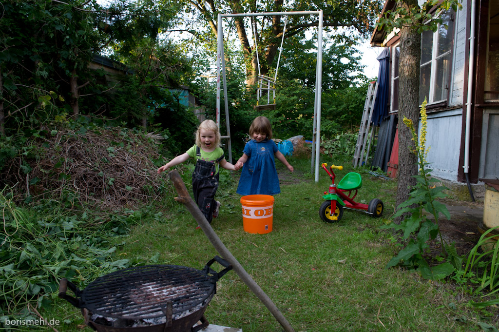 Sonntags im Garten. Es wird gegrillt, die Kinder spielen, baden, laufen durch den Garten. Panholzer’s und Christian sind zu Besuch. Die Blumen blühen. Nur das Beet ist noch voller Unkraut und die Haufen von Grünschnitt des Vorgängers und von uns sind noch riesig. Ein Berg an Arbeit…