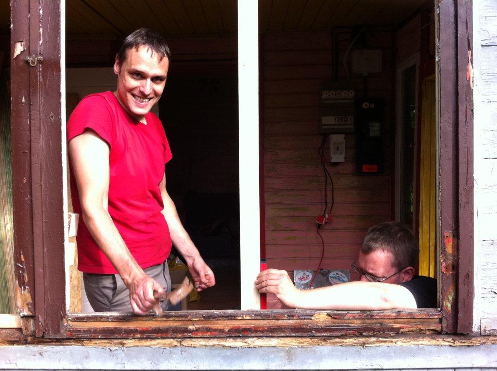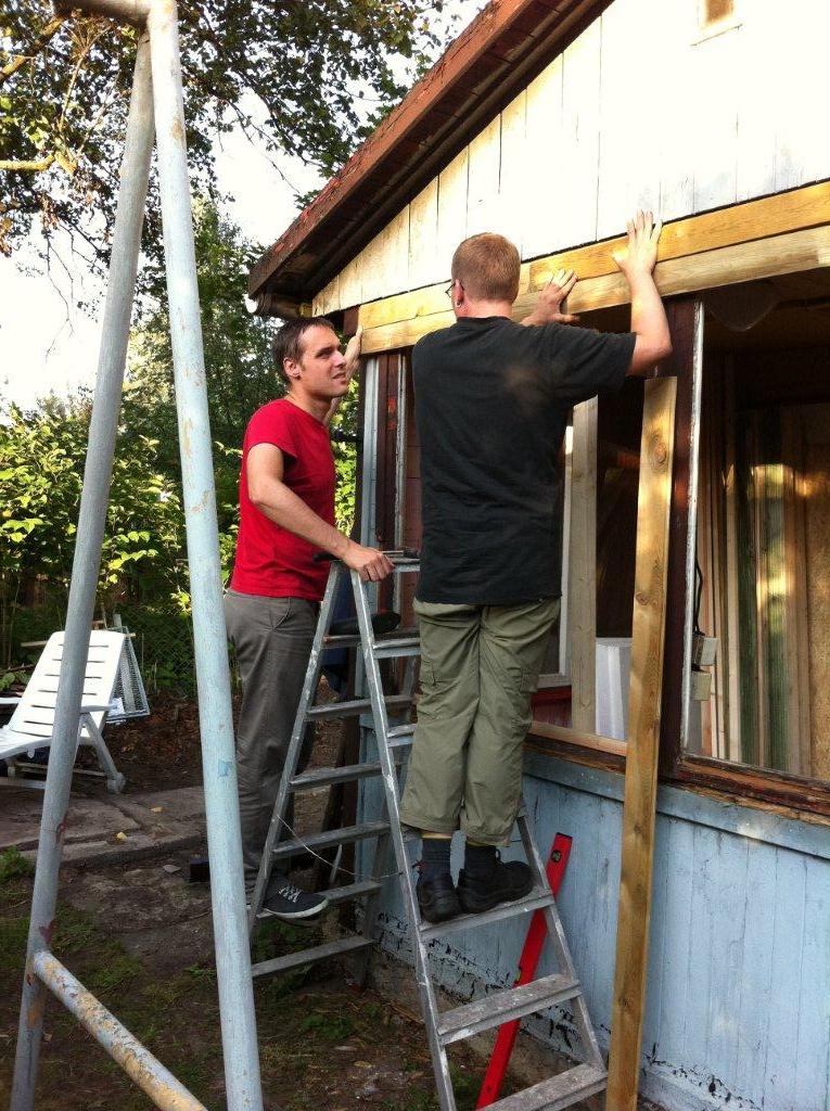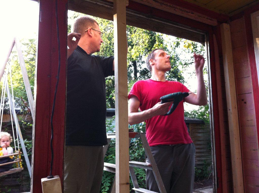 Mit Frank zusammen habe ich nachmittags bis abends spät die Wetterseite erneuert. Fenster raus, Stützbalken innen eingezogen, Rauspund außen drauf. Lieschen hat in der Zwischenzeit Margaretha auf der Schaukel angeschoben.